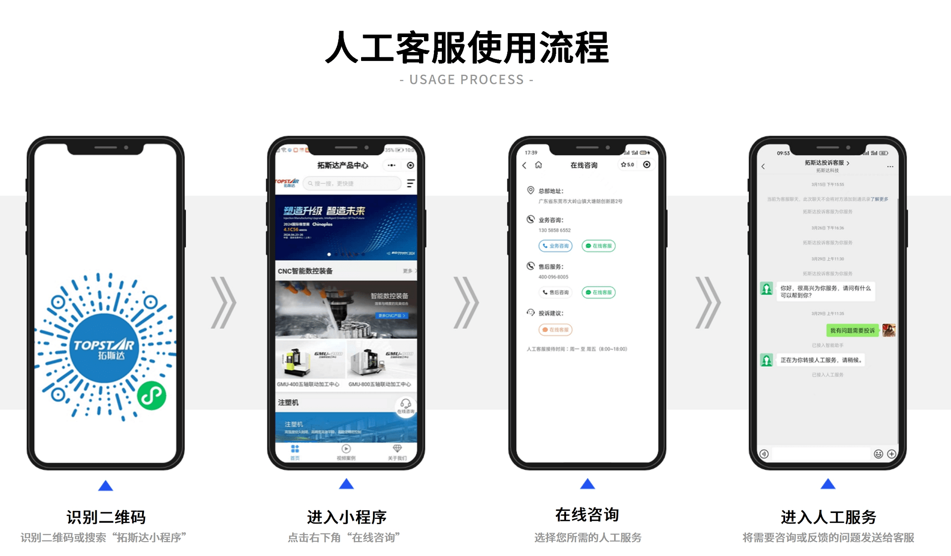 拓斯達始終把客戶的需求和反饋放在首位,為此,我們在小程序設置【在線咨詢】功能,客戶可以直接向企業反饋在使用產品或服務過程中遇到的問題,讓每位客戶都能輕松地與我們對話。