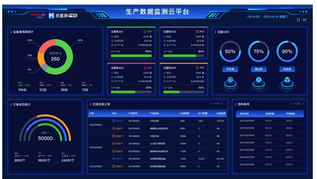“深度MES的配置,周期長,難度大,成本高,是近年來企業(yè)管理信息化遇到的瓶頸。這個過程在注塑企業(yè)導入信息化系統(tǒng)時往往被忽視,最終導致信息管理看板成了擺設,針對發(fā)展程度不同的企業(yè)需要有更靈活的MES方案。”楊靖介紹道。因此,我們研發(fā)更加輕量化、低成本的拓星脈MES系統(tǒng)和IoT數(shù)字平臺,通過按需采集制造過程中的物理數(shù)據(jù),靈活滿足管理需求和各系統(tǒng)數(shù)據(jù),實現(xiàn)車間制造成本控制、生產(chǎn)經(jīng)營過程透明、裝備和產(chǎn)品信息集成,并配置本地化數(shù)據(jù)服務器,電腦、平板、手機等多樣終端,為企業(yè)打造制造協(xié)同管理平臺,準確把控生產(chǎn)過程。